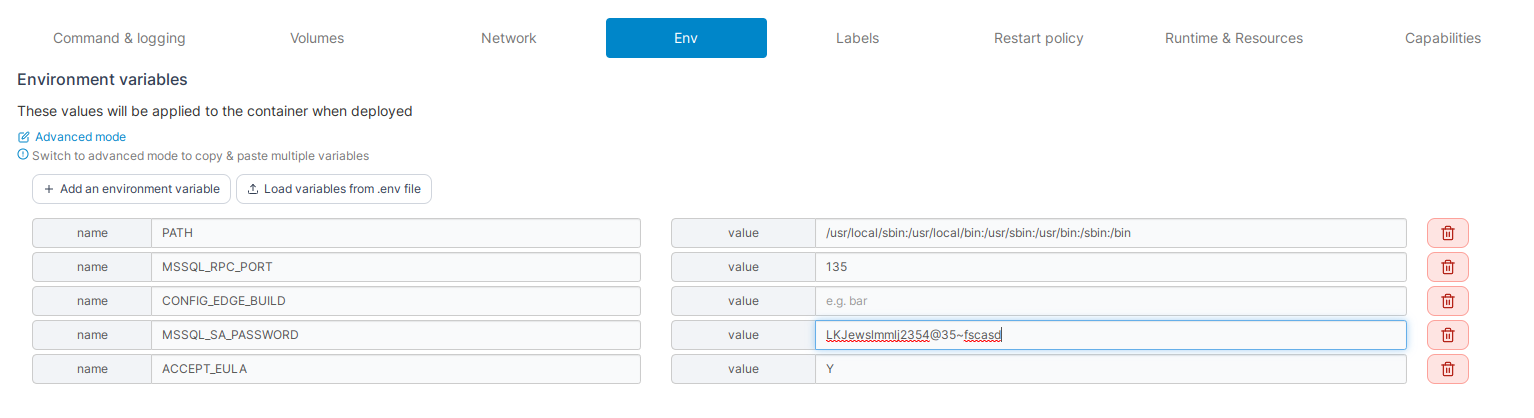 For the most part I don't change any settings until after I stand up a new image as I am not always sure what the outcomes will be until it is all fired up. With this particular image, Microsoft documentation will require a few extra environmental variables to make it work, namely adding in the EULA acceptance and an SA password. Portainer makes this easy to just add to the ENV tab at the bottom of the deployment panel.