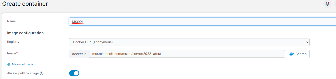 Enter a name to identify this container and the image I am pulling will be the Server 2022 variety - mcr.microsoft.com/mssql/server:2022-latest